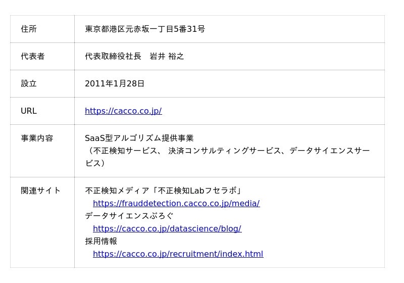 Caccoは、「未来のゲームチェンジャーの『まずやってみよう』をカタチに」という経営ビジョンを掲げ、セキュリティ・ペイメント・データサイエンス技術をもとに、アルゴリズム及びソフトウエアを開発・提供し企業の課題解決やチャレンジを支援することを目指しております。 オンライン取引における「不正検知サービス」を中核サービスとして位置づけ、不正ログインから不正注文対策まで対応可能な国内での導入実績数No.1※2の不正検知サービス「O-PLUX」や金融機関や会員サイトにおける情報漏洩対策の不正ログイン検知サービス「O-MOTION」、フィッシング対策サービス等を提供しております。