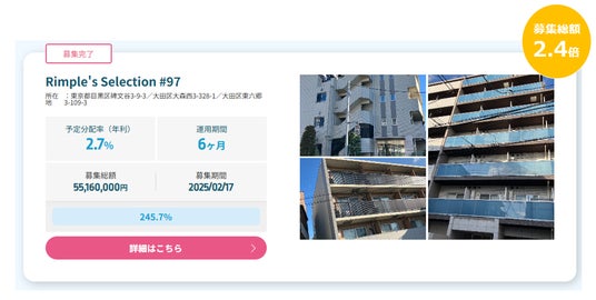プロパティエージェントの展開する不動産クラウドファンディングRimple’s Selection#97募集総額245.7%の1.35億円の応募