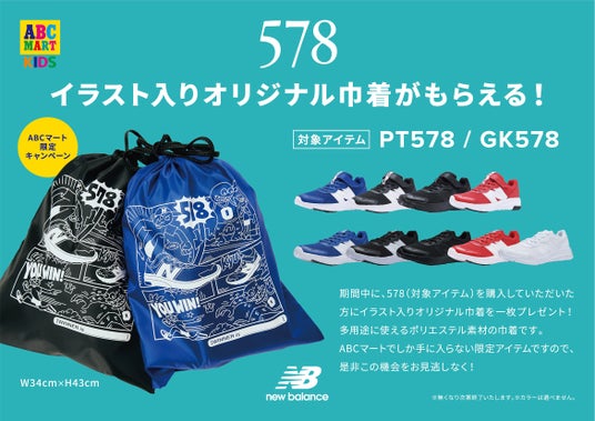 株式会社エービーシー・マート(本社:東京都渋谷区、代表取締役社長:野口実)は、キッズ向けランニングシューズ 「New Balance KIDS 578」 を全国のABC-MART店舗およびオンラインストアにて販売中です。また、ABC-MART限定で、「New Balance KIDS 578」のイラスト入りオリジナル巾着をプレゼントするキャンペーンも実施します。
