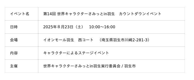 8月23日(土)開催 カウントダウンイベント 第14回 世界キャラクターさみっとin羽生