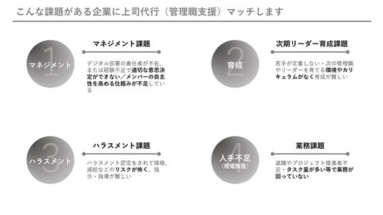 上記のような課題・状況を受け、「デジタル推進のプロが管理職の業務を支援する」という「上司代行」のニーズが急速に拡大しています。