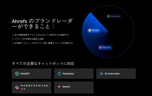 デジタルマーケティングおよび SEO ソリューションを提供する Ahrefs (エイチレフス)は、生成 AI 時代の新たなマーケティング指標である LLMO ( Large Language Model Optimization :大規模言語モデル最適化)の可視化を実現する「ブランドレーダー」をリリースしました。本ツールは、 ChatGPT 、 Gemini 、 AI Overviews 、 Perplexity 、 Copilot という主要 5 つの生成 AI プラットフォームにおける、ブランドや製品の言及数を瞬時に分析・比較できる業界初の生成 AI 可視化ツールです。