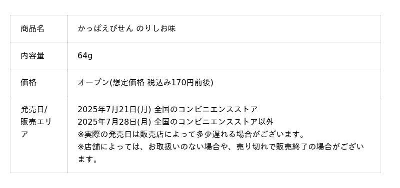 <ご参考>【「かっぱえびせん のりしお味」 期間限定で販売中!】カルビーでは、えびの風味と青のり、焼きのりの 2 種類ののりが絶妙にマッチした新商品『かっぱえびせん のりしお味』を期間限定で販売中です(同年11月上旬終売予定)。のり感をアップすることで、磯の香りを際立たせ、「のりしお味」の満足感を高めました。パッケージは、緑を基調に2種類ののりの写真を配置。味名には黄色を取り入れることで、のりしおの魅力を引き立てるデザインにしました。