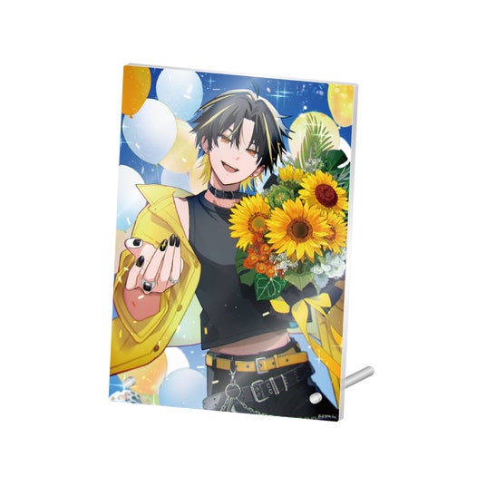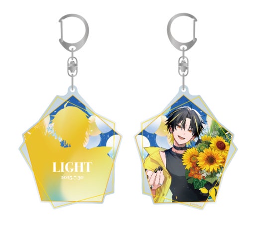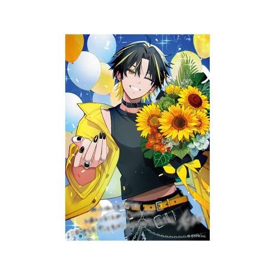 今回のバースデーグッズのために描き下ろされたビジュアルは、「明雷らいと」の魅力を最大限に引き出す、躍動感あふれるポージングとはじけるような笑顔が印象的です。彼の腕には、メンバーカラーでもあり7月の誕生花でもある「ひまわり」に彩られた花束が抱えられています。誕生日という特別な日を祝うにふさわしい、温かくも華やかなデザインに仕上がっています。