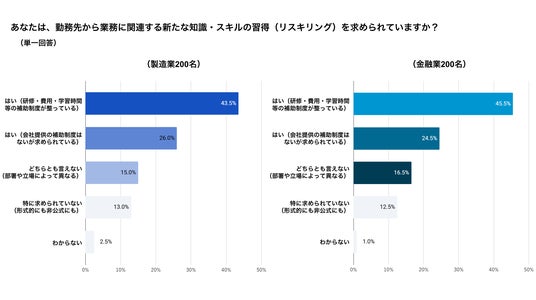- 「必要性を感じている」と回答した人は製造業39.0%、金融業45.5%となり、「どちらかというと必要性を感じている」との回答(製造業47.5%、金融業41.0%)と合わせると、両業界ともに86.5%がリスキリングの必要性を認識している結果となりました。