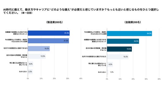 ● AI時代に備えて必要なこととしては、「今の業務をより効率化・高度化するためのスキル習得」(製造業31.0%、金融業34.5%)と「他職種や他業務にも対応できる柔軟なスキルセット」(製造業31.5%、金融業24.5%)が上位となり、業務適応力と拡張性の双方を意識する傾向が見られました。