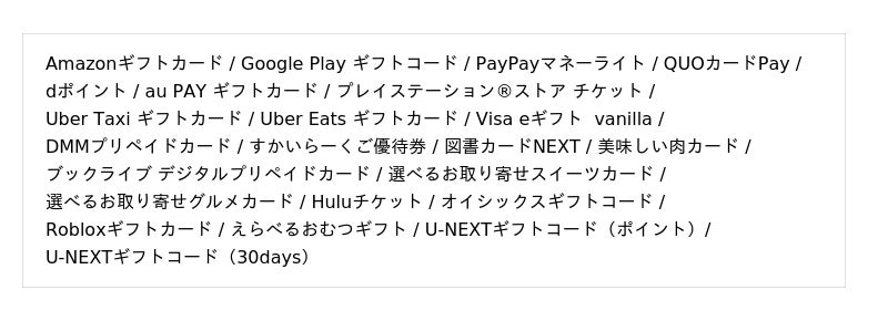 AmazonやGoogle Play、PayPay、QUOカード、dポイント、au PAYなど23種類