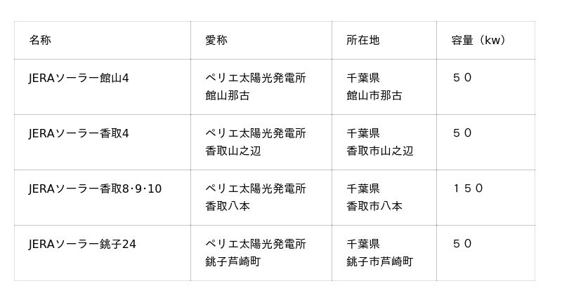 JERAが保有する千葉県内4ヶ所の太陽光発電所(合計容量:300kW)で発電した電力と環境価値を、アグリゲーターのJERA Crossが束ね、小売電気事業者のJR東日本商事を通じて、千葉ステーションビルが運営するペリエ西千葉本館ほか3 施設に供給します。千葉県内で発電し、供給される太陽光発電所由来の再生可能エネルギーを県内のペリエで消費する『千産千消』のオフサイト型コーポレートPPAを導入します。太陽光発電所の愛称を『ペリエ太陽光発電所』とすることで、地域に親しみやすく、そして地域のエネルギーにコミットする存在にしたいという思いを込めました。