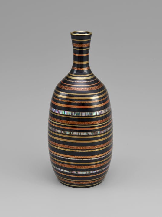 【漆芸】室瀬和美 金胎蒔絵螺鈿縞文花器(径10.3×高さ23cm)