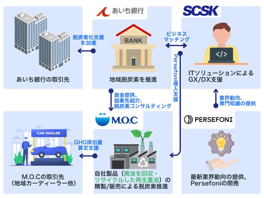 地球温暖化対策が喫緊の課題となる中、地域金融機関であるあいち銀行(本社:愛知県名古屋市、代表取締役頭取執行役員:鈴木 武裕、以下 あいち銀行)は、地域社会の持続可能な発展に貢献するため、取引先の脱炭素化支援を積極的に推進しています。あいち銀行は、既にSCSKの支援のもとPersefoniを導入しており、その実績を基に取引先に対しても脱炭素支援の一環として、Persefoniの活用を推奨しています。その中で再生重油事業を通じて循環型社会に貢献するM.O.Cに対し、GHG排出量算定の高度化に有効な炭素会計プラットフォームPersefoniを紹介しました。SCSKは、Persefoniに関する豊富な知見と導入・運用支援の実績を有しており、M.O.Cの高度なGHG排出量算定体制構築を支援することとなりました。M.O.Cは、Persefoniを活用することで、スコープ1、2に加え、サプライチェーン全体を含むスコープ3のGHG排出量のより精緻な算定と管理を行い、持続可能な地域社会の実現に貢献します。なお、本導入においては中小企業において、スコープ3のGHG排出量算定と管理に本格的に取り組む事例はまだ少ない中、先駆けとなる取り組みとなります。