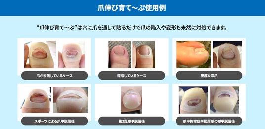 「爪伸び育て~ぷ」は、足の爪の痛みや変形を未然に防ぐセルフケア用品(一般医療機器)です。爪切りの失敗や靴による圧迫や衝撃などで起こる、短くなった爪の問題に対して、貼るだけで簡単にケアが行えます。