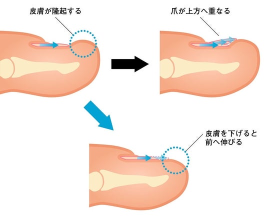 ・足の場合、爪周囲の皮膚が隆起して爪を食い込ませます。