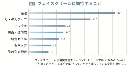 SHIMBI METHIODでは、新クリーム開発にあたり、クリニカルシーンでのクリームの存在意義やユーザーの期待値(表2)に立ち返り、美容液に期待するような機能性を追求するのではなく、前述の調査結果などの実態を踏まえ、1.クリームの本来の価値・機能に立ち返った「保湿機能の強化」2.通年使いやすい「テクスチャー設計」を追求しました。