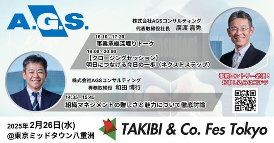株式会社AGSコンサルティング(本社:東京都千代田区、代表取締役会長:虷澤篤志 代表取締役社長:廣渡嘉秀。以下「AGS」)は、2025年2月26日(水)に東京ミッドタウン八重洲で開催される、アトツギ(老舗企業)とスタートアップ(新興企業)の共創イベント「TAKIBI&Co. Fes Tokyo(タキビコフェストーキョー)」に、廣渡嘉秀 代表取締役社長と和田博行 専務取締役が登壇することをお知らせいたします。