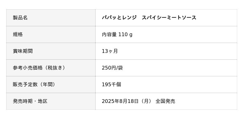 『パパッとレンジ パスタソース』シリーズは、電子レンジ対応パウチを使用し、“いつものお昼ご飯に手軽に楽しめるパスタソース”を製品コンセプトにした製品です。今回は、黒こしょう・ハラペーニョ・ガーリックと3種のスパイスを使い、じわッと辛く深みがあり、香ばしく仕上げたミートソースを発売します。