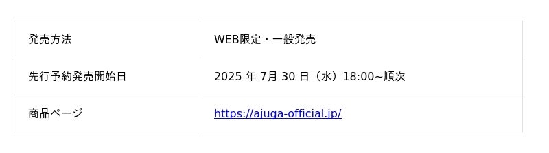 本日2025年7月30日(水)より公式WEBストア(https://ajuga-official.jp/)にて先行予約販売をスタート、2025年8月5日(火)23:59までにプレオーダーアイテムを合計15,000円(税抜)以上購入の方には、購入合計金額から10%OFFのキャンペーンも開催します。