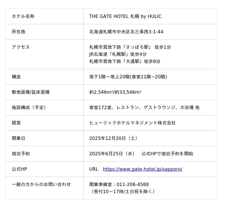 ヒューリックホテルマネジメント株式会社(所在地:東京都中央区日本橋小舟町13-8)は、「ザ・ゲートホテル」ブランドとして北海道初となる『THE GATE HOTEL 札幌 by HULIC』を、2025年12月20日(土)に開業いたします。