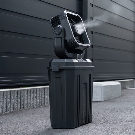 10Lの大容量タンクを搭載した大型ミストファン。気温35度以上だとファンだけでは温風となり逆効果になってしまいます。ミストの気化熱により酷暑でもしっかり体を冷却することが出来ます。水の残量が把握できる半透明の窓付きで、水が切れる前に補充することが出来ます。熱中症対策に最適です。