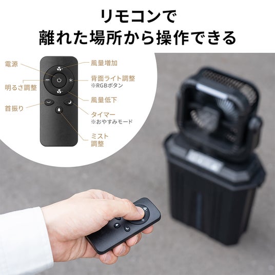 10Lの大容量タンクを搭載し、水と風でしっかり冷却でき、風量や角度などをリモコンで操作可能な連続9時間使用できる大型ミストファン