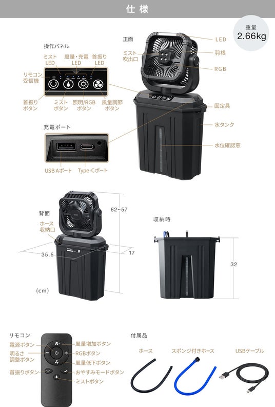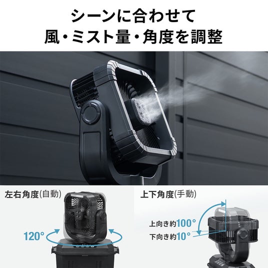ミストファン 扇風機 10L 自動首振り コードレス USB Type-C 充電式 20000mAh キャンプ 現場 強力送風 リモコン ブラック