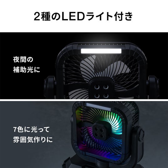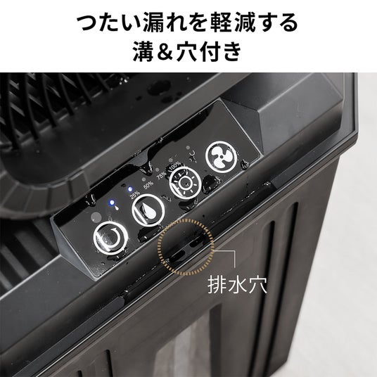 ファン本体にLEDが搭載されており、夜間の補助光にすることが出来ます。また、ミストの噴射口から垂れてきた水をタンクに戻すための溝と穴付きでつたい漏れを軽減してくれます。使用中水が無くなってきた際は背面のホース収納口から給水できるため、ファンを止める必要がありません。