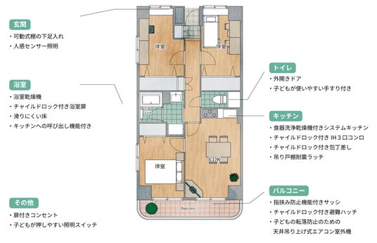居室には賃貸では希少なキッチン用食器洗い乾燥機を導入し、毎日の家事負担を大幅に軽減。また、包丁収納部やIHコンロ、浴室扉、避難ハッチなど随所にチャイルドロックを設置し、小さなお子さまの安全を確保しています。トイレは手すり付きでゆとりのある空間とし、トイレトレーニング中の見守りにも対応。バルコニーの窓サッシには指はさみ防止機能を備え、照明スイッチはユニバーサルデザインを採用するなど、細部まで子育て世代の快適性と安心にこだわりました。
