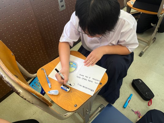 対馬西部中学校の探究授業で平和カルタを作成。長崎県の歴史を振り返り平和への行動を行った。