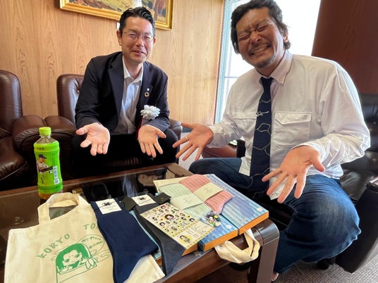 吉村裕之広陵町長に地場産業の靴下の紹介を受ける中村(奈良県広陵町にて)