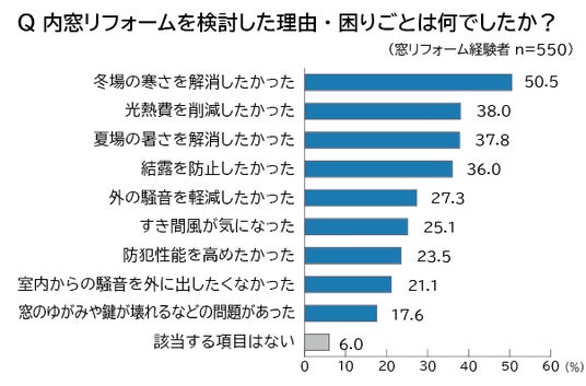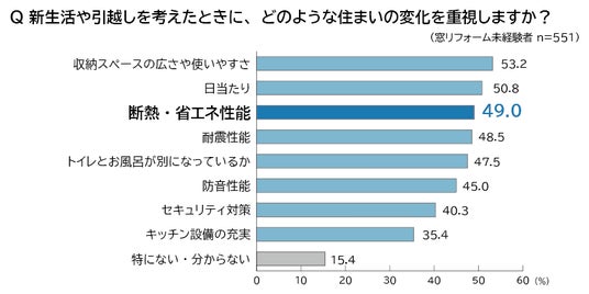 「住まいに関するアンケート」を窓リフォーム経験者と未経験者1,101名に実施 窓リフォーム未経験者の約49%が、新生活や引越しの際に「断熱・省エネ性能」を重視