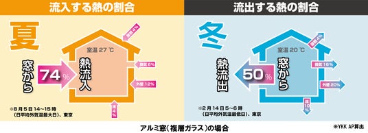 住まいの中で熱の出入りが最も多いのは「窓」です。夏は外から入ってくる熱のうちの74%が窓から入り、冬は室内の熱の50%が窓から出て行ってしまいます。つまり断熱性能が低い窓の場合、冬はどんなに暖房をしてもせっかく温めた暖気が外に流出し、夏はせっかく冷房で室内を冷やしても窓から入ってくる日差しの影響が大きくエアコン効率は上がりません。住まいの不満の上位にあがった「暑さ・寒さ」を解決するには、窓からの熱の流出入を最小限にするのが1番の近道です。