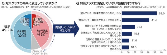 さらに、実施している対策に対する満足度を聞いたところ、「十分に満足している」と答えた人はわずか7.1%で、「多少、満足している」と答えた人を合わせても満足度は49.2%と約半数でした。反対に、「あまり満足していない」「全く満足していない」と答えた人が42.0%となり、満足している人と拮抗する結果となりました。「満足していない」と回答した人にその理由を聞いたところ、53.0%の人が「効果を感じられない」と回答し、不満足なまま仕方なく対策を実施していることがうかがえます。特に、住まいの暑さ・寒さを改善しようとエアコンなどを使用することで、光熱費の高さに悩む悪循環に陥っている人が多いことも読み取れます。