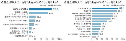 窓リフォーム未経験者に、暑さ・寒さ対策として自宅で使用しているモノや実施していることを調査したところ、1位は暑さ・寒さ対策ともに「エアコンをつける(寒さ対策:52.1%、暑さ対策:76.6%)」となり、冷暖房に頼っていることが分かりました。そのほか、暑さ対策では「扇風機、冷風機、サーキュレーターをつける(64.1%)」、寒さ対策では「厚着をする(50.5%)」「厚手の靴下やスリッパを履く(42.3%)」「個別の暖房器具を使う(41.6%)」という人が多いことが分かりました。