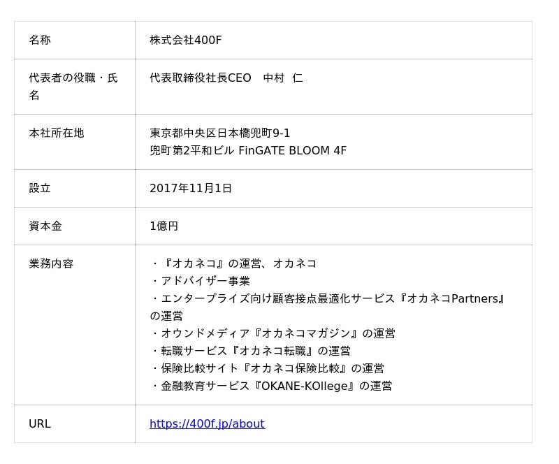 400Fは、"お金の問題を出会いで解決する"ことをミッションに2017年11月に設立され、自社でお金のプロ(FP・公的保険アドバイザー等)を抱え、オンライン上で直接ユーザーに金融商品や転職、不動産を仲介するオカネコ事業(ToC)と、大手金融機関や事業会社に対してユーザーとのコミュニケーション最適化を支援するエンタープライズ事業(ToB)を通じて、日本の個人金融資産にアプローチするFinTechスタートアップです。