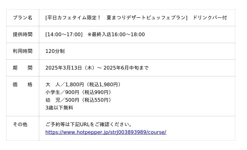 連日の猛暑で、外出もためらいがちなこの夏。2025年8月4日(月)、テラスビュッフェ TABLEは、涼しい店内で“夏まつり気分”を味わえる、ちょっと特別なデザートビュッフェをご提案します。
