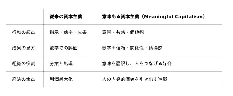 Meaningful Capitalismとは、まさにその「人間らしい進化」を、日常のふるまい・問い・関係性の中に組み込んでいく経営構造です。