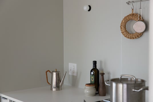 II型配置のキッチンの、コンロ周りを囲う壁・天井に。落ちる影が柔らかくきれい(ライトグレー)