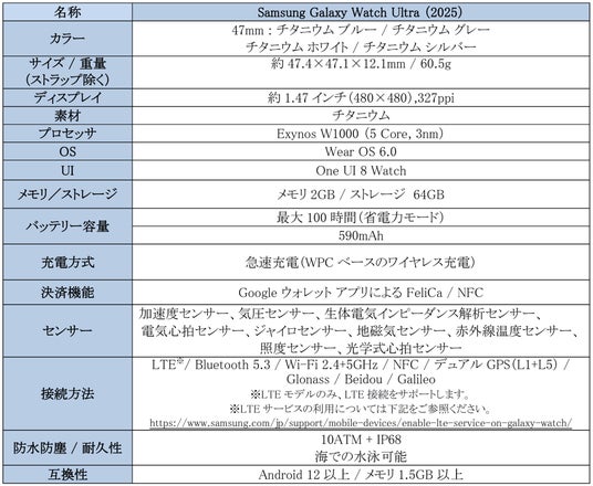 <主な仕様 : 「Samsung Galaxy Watch Ultra (2025)」>