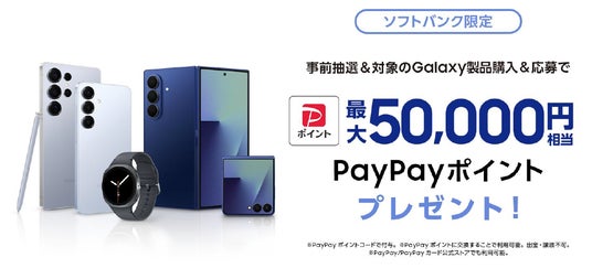 対象期間中に専用URLより抽選後、ソフトバンク取扱店及びソフトバンクオンラインショップにて、「Samsung Galaxy Z Flip7」、「Samsung Galaxy Z Fold7」などを購入・応募された方にPayPayポイントをプレゼントいたします。