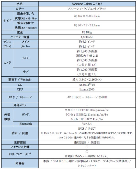 <主な仕様 :「Samsung Galaxy Z Flip7」>