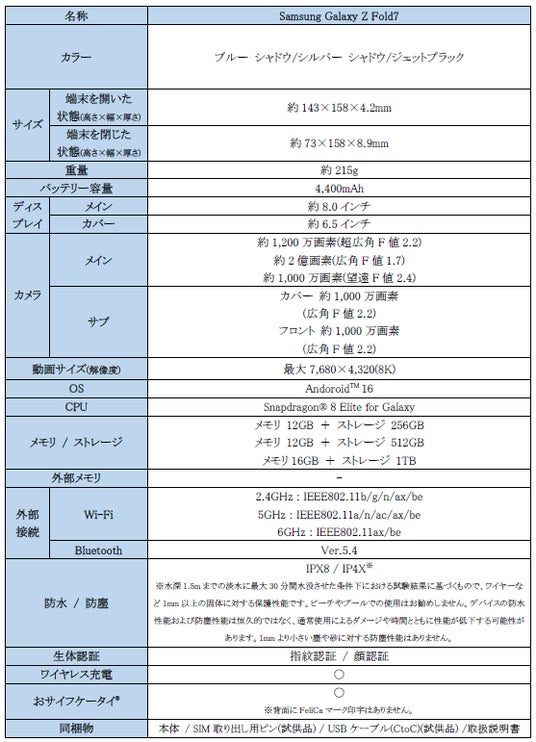<主な仕様 : 「Samsung Galaxy Z Fold7」 (SIMフリーモデル)>