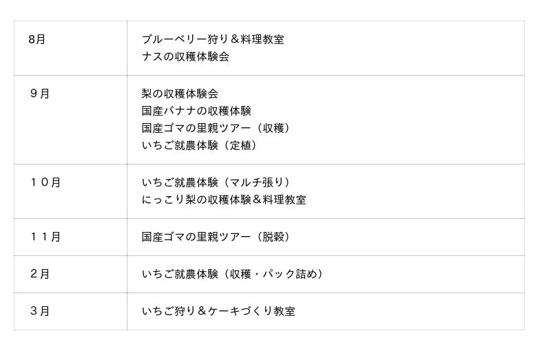 例えば、摘果から収穫まで収穫体験できる「梨収穫体験」や採れたて新鮮なナスをその場で食べられる「ナス収穫体験」など、ユニークな企画をたくさんご用意しています。