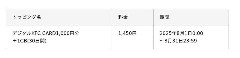 KDDI、沖縄セルラーは2025年8月1日から、povo2.0の期間限定トッピングとして、「ケンタッキーフライドチキン」の「デジタルKFC CARD1,000円分」と「1GB(30日間)」がセットになったトッピングを1,450円で提供します。データ購入とあわせて、ケンタッキーフライドチキンでのお食事をおトクにご利用いただけます。