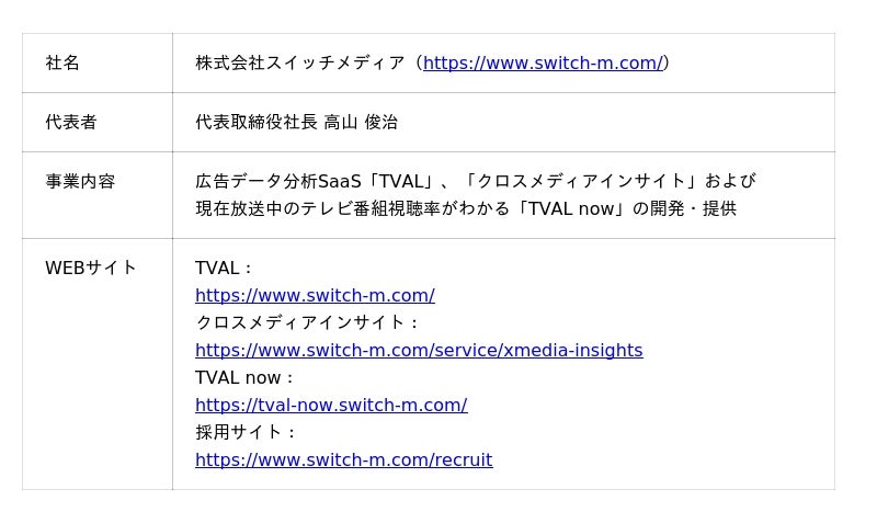 スイッチメディアについて株式会社スイッチメディアは、国内最大規模のテレビ視聴パネルから取得したテレビCM接触データとインテージ社の購買データ(SCI(R))をシングルソースで連携させ、テレビCMの売上効果の分析を実現するSaaSプロダクト「TVAL」、またテレビCM+デジタル広告の出稿データを統一指標で一元管理し、過去比較やブランド横断分析を通じてメディア予算アロケーションを支援するSaaSプロダクト「クロスメディアインサイト」の開発・運営を行っています。