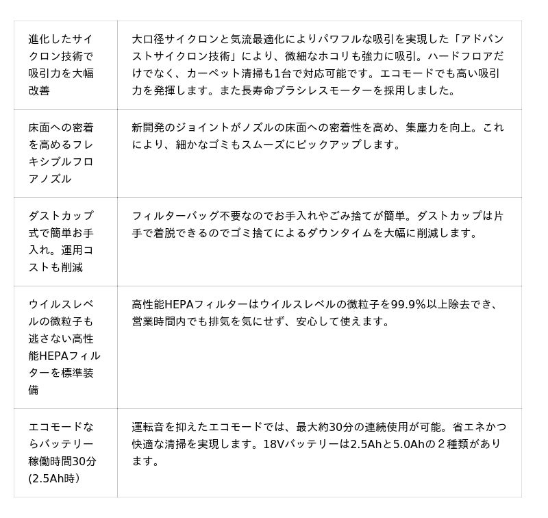 コードレス×高吸引力で、営業時間中の清掃をより快適に