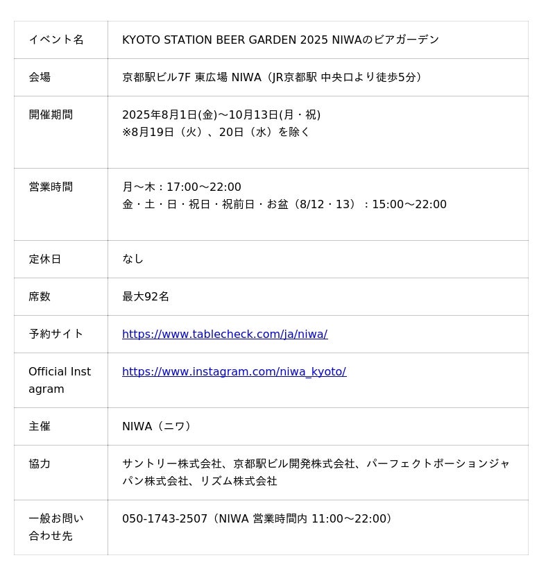 『KYOTO STATION BEER GARDEN 2025 NIWAのビアガーデン』、2025年8月1日(金)~10月13日(月・祝) 開催