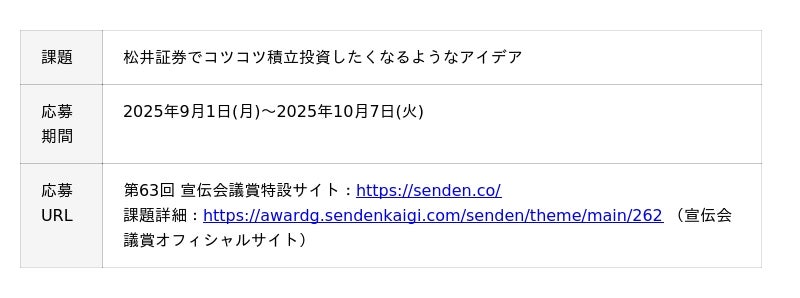 松井証券株式会社(本社:東京都千代田区、代表取締役 社長執行役員:和里田 聰、以下「当社」)は、日本最大級の公募広告賞である第63回「宣伝会議賞」に協賛し、「松井証券でコツコツ積立投資したくなる」アイデアを募集いたします。