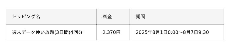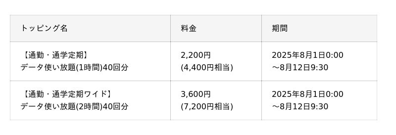 (注3)2025年6月1日から8月19日まで期間限定提供している「データ使い放題(2時間)180円」の40回分相当。
