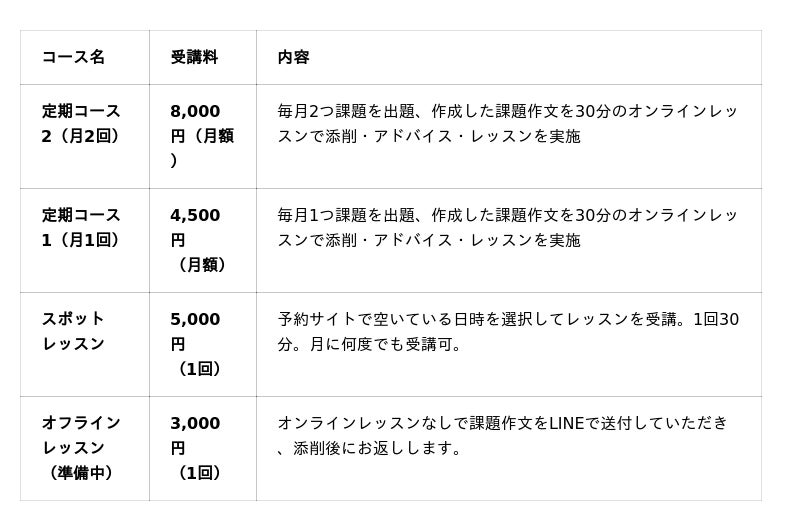 原稿提出方法:手書き原稿はスマホ等で撮影した画像を、電子ファイルはMicrosoft WordやGoogleドキュメントなどのテキストエディタで作成したものを、レッスン前にLINEで送付