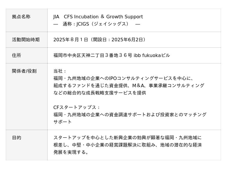 全国の中堅・中小企業の成長戦略を多様なサービスで支援する、当社および当社子会社である株式会社CFスタートアップス(以下、CFスタートアップス)は、新たな福岡における拠点「JIA CFS Incubation & Growth Support (通称:JCIGS(ジェイシッグス))」を共同で設置し、活動を開始いたしましたので、下記の通りお知らせいたします。