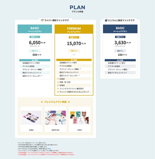 当社が運営する「にじさんじ」では、公式ファンクラブ「にじさんじ FAN CLUB」を2020年10月より運営開始いたしました。にじさんじ公式としてのファンクラブ「にじさんじ総合ラウンジ」およびライバー個別のファンクラブを運営しており、現在30以上のファンクラブを運営中です。 ライバー個別のファンクラブでは、限定コンテンツや、ライバーと交流することができる専用チャット、年3回の会報誌、会員証、カスタムスタンプなどを楽しめます。にじさんじ総合ファンクラブでは絵日記、ブログ、動画の限定コンテンツや専用チャット、アプリ版会員証などを楽しめます。さらに、イベントの先行抽選(ファンクラブ限定)へご応募いただけます。なお、ファンクラブ会員限定イベントへのご参加も可能です。